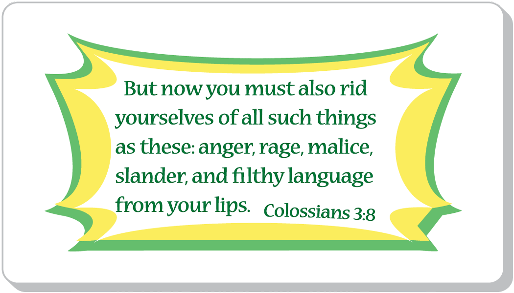 BIBLE VERSE - But now you must also rid yourselves of all such things as these: anger, rage, malice, slander, and filthy language from your lips. Colossians 3:8