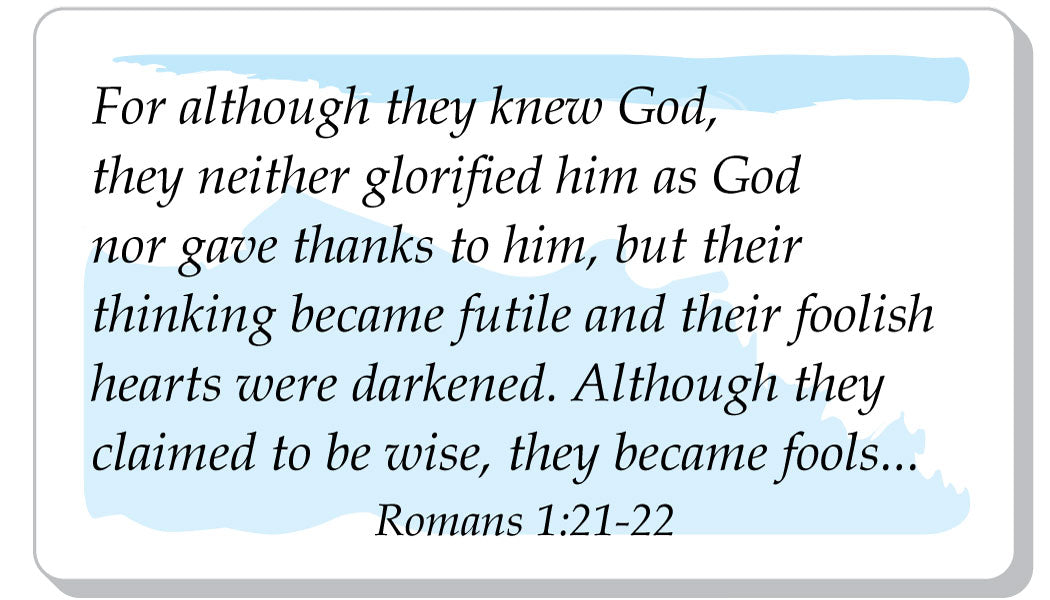 BIBLE VERSE - For although they knew God, they neither glorified him as God nor gave thanks to him, but their thinking became futile and their foolish hearts were darkened.  Although they claimed to be wise, they became fools... Romans 1:21-22