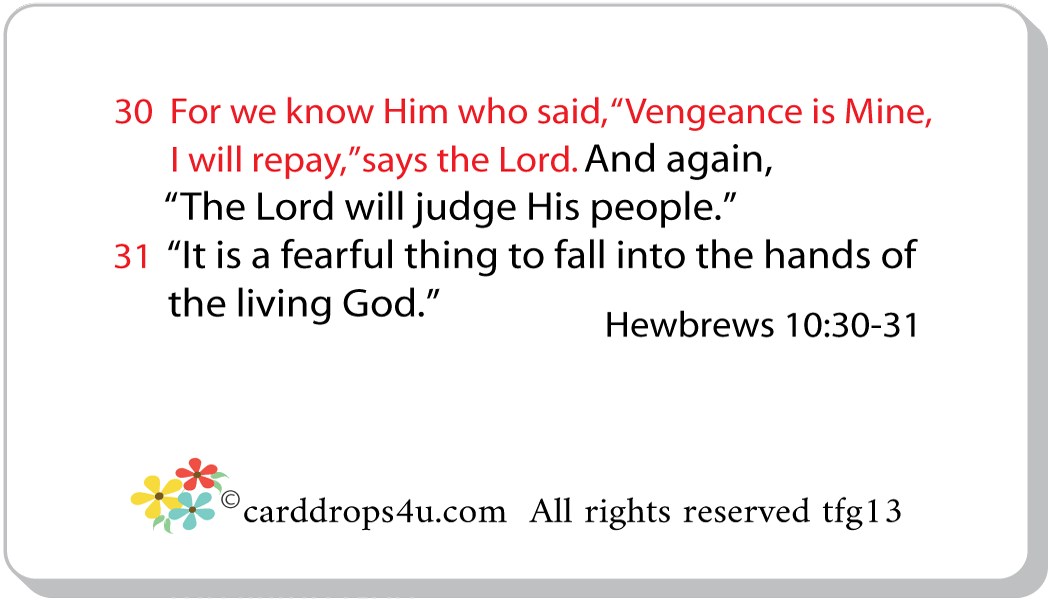 BIBLE VERSE - 30 For we know Him who said, "Vengeance is Mine, I will repay," says the Lord And again, "The Lord will judge His people." 31 "It is a fearful thing to fall into the hands of the living God. Hebrews 10:30-31