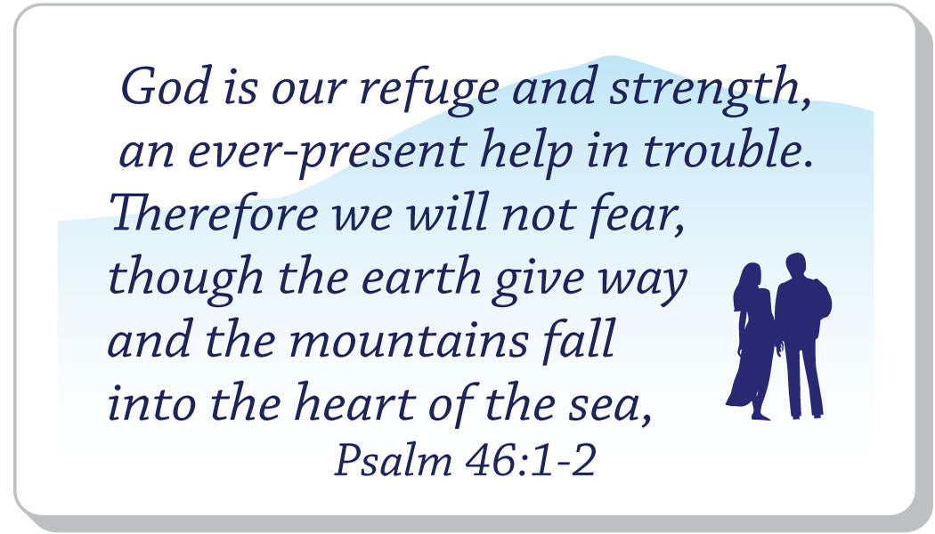 BIBLE VERSE - God is our refuge and strength, an ever-present help in trouble. Therefore we will not fear, though the earth give way and the mountains fall into the heart of the sea, Psalm 46:1-2