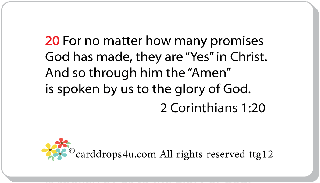 BIBLE VERSE - 20 For no matter how many promises God has made, they are "Yes" in Christ. And so through him the "Amen" is spoken by us to the glory of God.  2 Corinthians 1:20