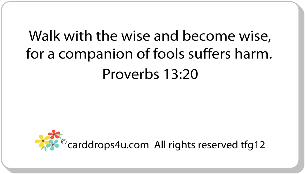 BIBLE VERSE - Walk with the wise and become wise, for a companion of fools suffers harm.  Proverbs 13:20