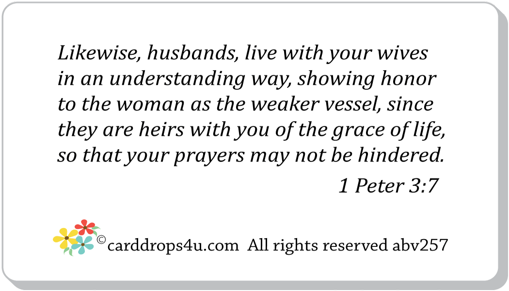 BIBLE VERSE - Likewise, husbands, live with your wives in an understanding way, showing honor to the woman as the weaker vessel, since they are heirs with you of the grace of life, so that your prayers may not be hindered. 1 Peter 3:7