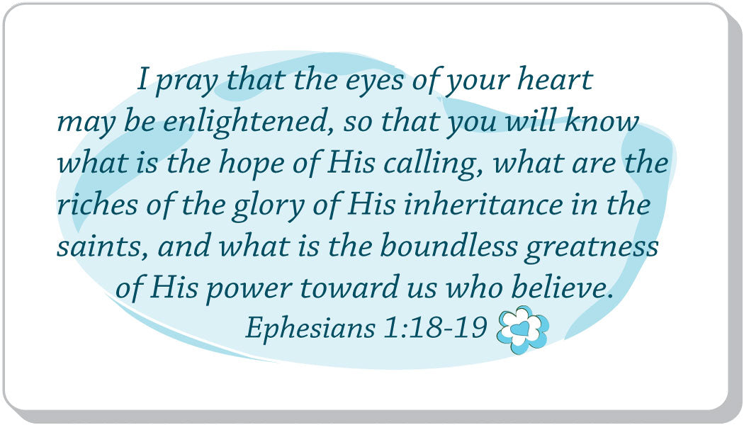 BIBLE VERSE - I pray that eyes of your heart may be enlightened, so that you will know what is the hope of His calling, what are the riches of the glory His inheritance in the saints, and what is the boundless greatness of His power toward us who believe. Ephesians 1:18-19