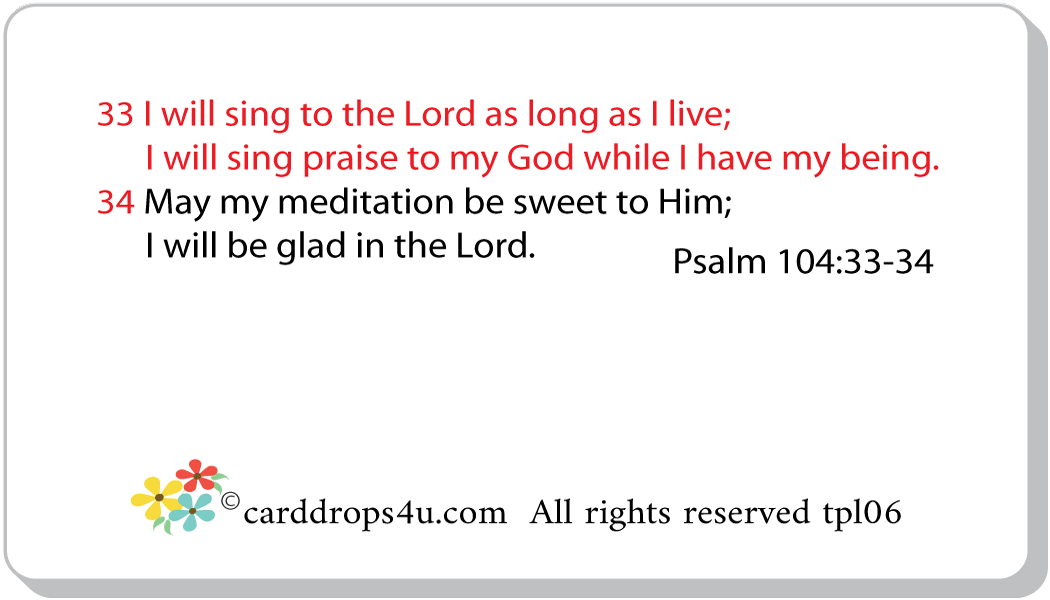 BIBLE VERSE - 33 I will sing to the Lord as long as I live; I will sing praise to my God while I have my being. 34 May my meditation be sweet to Him; I will be glad in the Lord. Psalm 104:33