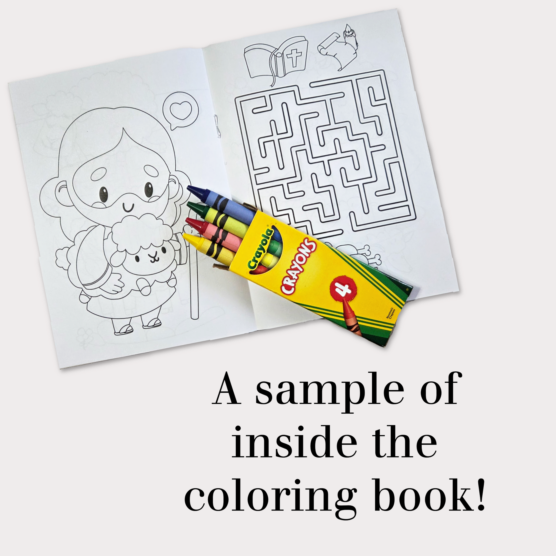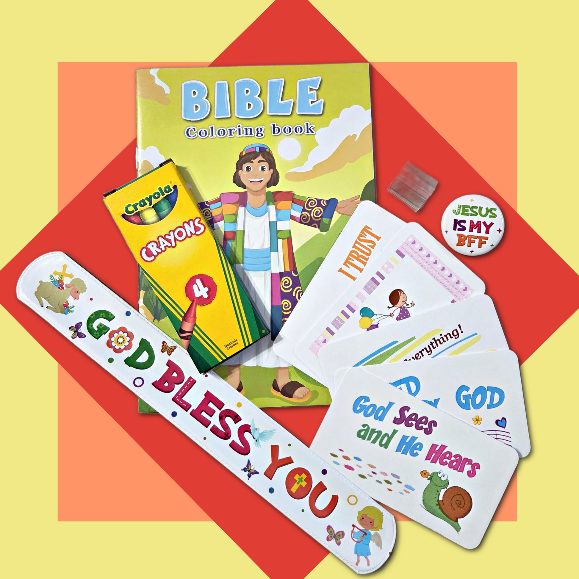 Kids will enjoy the Bible coloring book (4.25 x 6.25) with meaningful Biblical illustrations. The set comes with Crayola crayons and are break resistant. The biblical illustrations in the coloring book can also serve as a way to teach kids about the things of the Bible. Coloring book styles vary.