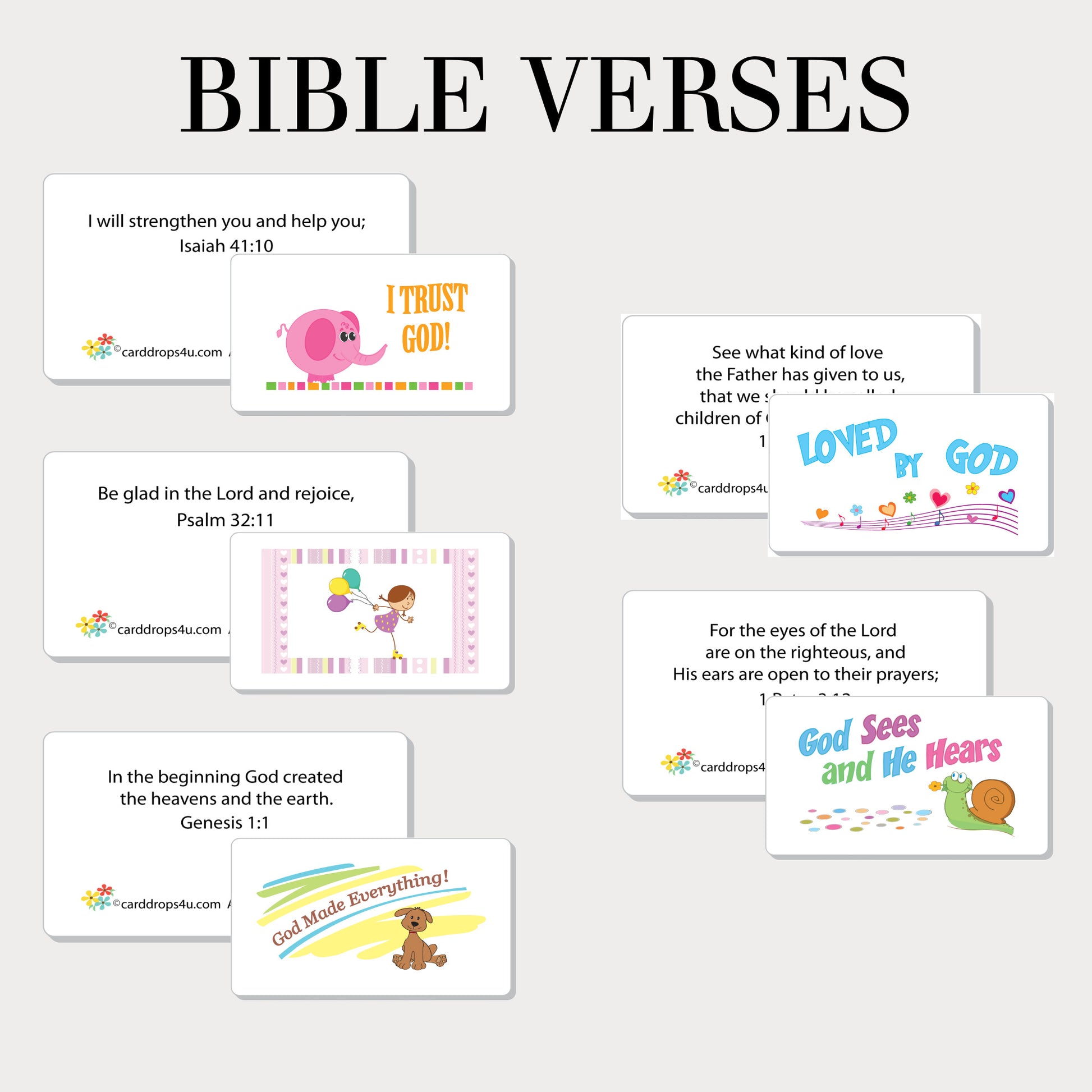 Sunshine Activity Sets for the young are designed for fun, for expressing creativity and for learning God's word. Set A has five (5) Bible Verse Cards. A special message is printed on the front of each card and a Bible verse on the back of the card. Each verse has been carefully chosen to motivate kids to learn and memorize the verse. Included is a card holder.