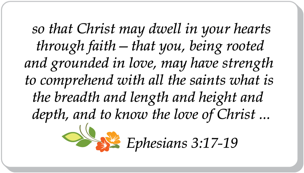 BIBLE VERSE - so that Christ may dwell in your hearts through faith-that you, being rooted and grounded in love, may have strength to comprehend with all the saints what is the breadth and length and height and depth, and to know the love of Christ which surpasses knowledge, that you may be filled to all the fullness of God. Ephesians 3:17-19