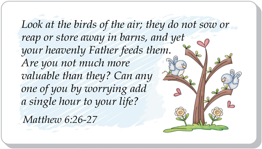 BIBLE VERSE - Look at the birds of the air; they do not sow or reap or store away in barns, and yet your heavenly Father feeds them. Are you not much more valuable than they? Can any one of you by worrying add a single hour to your life? Matthew 6:26-27