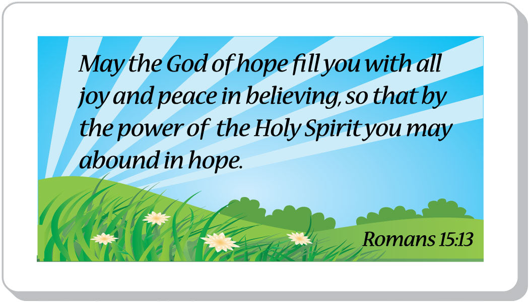 BIBLE VERSE - May the God of hope fill you with all joy and peace in believing, so that by the power of the Holy Spirit you may abound in hope. Romans 15:13