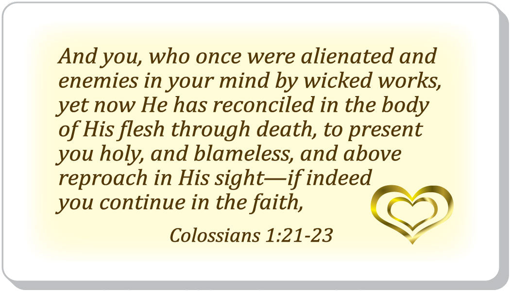 BIBLE VERSE - And you, who once you were alienated from God and were enemies in your minds because of your evil behavior.  But now He has reconciled you by Christ's physical body through death to present you holy in his sight, without blemish and free from accusation -  if you continue in your faith, established and firm, and do not move from the hope held out in the gospel. Colossians 1:21-23