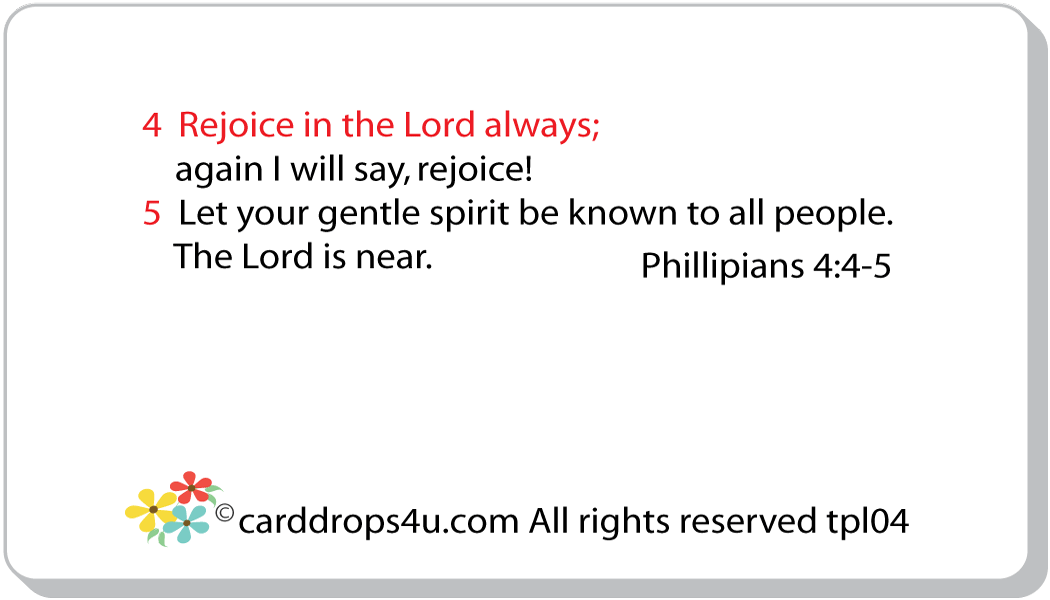 BIBLE VERSE - 4 Rejoice in the Lord always; again I will say, rejoice! 5 Let your gentle spirit be known to all people. The Lord is near.  Philippians 4:4-5