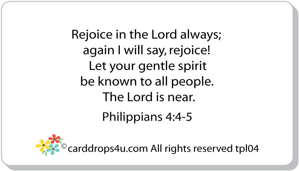 BIBLE VERSE - Rejoice in the Lord always; again, I will say, rejoice! Let your gentle spirit be known to all people. The Lord is near. Philippians 4:4-5