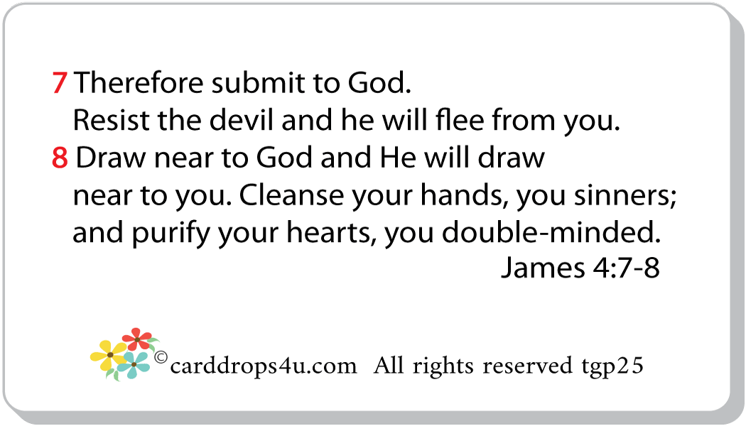 BIBLE VERSE - 7 Therefore submit to God. Resist the devil and he will flee from you. 8 Draw near to God and He will draw near to you. Cleanse your hands, you sinners; and purify your hearts, you double-minded. James 4:7-8