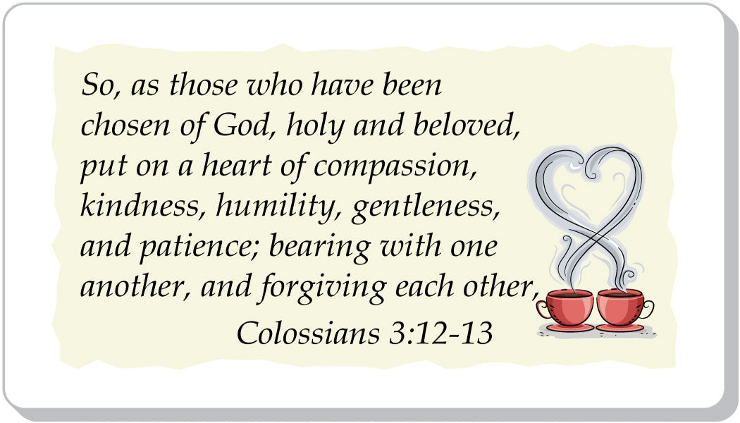 BIBLE VERSE - So, as those who have been chosen of God, holy and beloved, put on a heart of compassion, kindness, humility, gentleness, and patience; bearing with one another, and forgiving each other, whoever has a complaint against anyone; just as the Lord forgave you, so must you do also.  Colossians 3:12-13