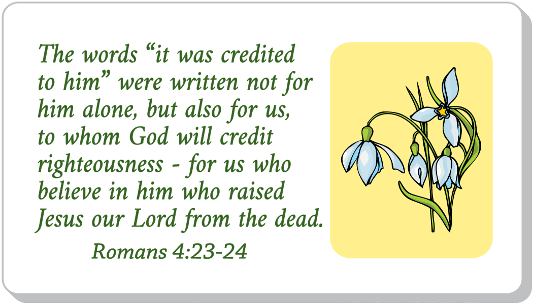 BIBLE VERSE - The words "it was credited to him" were written not for him alone, but also for us, to whom God will credit righteousness- for us who believe in him who raised Jesus our Lord from the dead. Romans 4:23-24